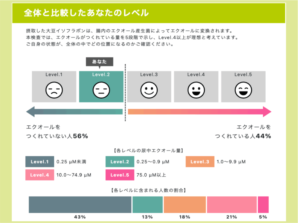 検査ではエクオールレベル2でしたが、もしかしたら今後検査をしたら上がっているかもしれませんね。